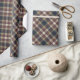 This elegant and contemporary gift wrapping paper showcases a plaid pattern in shades of green, dark blue, red, and ochre yellow, creating a classy and nostalgic English holiday atmosphere. The paper is perfect for wrapping Christmas gifts in a classic colonial style and complements a charming country cottage or log cabin theme.