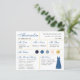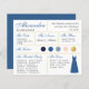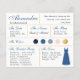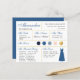 A classic blue and gold bridesmaid info card, including information about the wedding date and location, the wedding colours, the bridal party, the bridesmaid dress and a bridesmaid proposal message. The name of the bridesmaid and the titles are written in a blue elegant script. In the lower right corner, there is a blue dress. In the centre, there are the wedding colours in circles: 3 nuances of blue, blush pink and gold. The colours, including the colour of the wedding dress, can be changed, with the exception of the silver circle, that is faux gold foil.