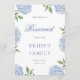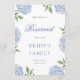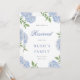 This beautiful design features an all around frame of blue hydrangea blooms and your custom text on the front and back. Punch a hole in the top and add your own ribbon to hang on a chair. Use the template form to add your information.