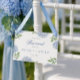 This beautiful design features an all around frame of blue hydrangea blooms and your custom text on the front and back. Punch a hole in the top corners and add your own ribbon to hang on a chair. Use the template form to add your information.