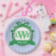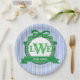 This elegant paper plate features a timeless blue and white striped background, reminiscent of classic coastal and preppy designs. A personalised monogram is beautifully framed within a Greek key border and adorned with a charming green bow. Ideal for nautical-themed parties, summer gatherings, southern-style celebrations, or preppy brunches, this stylish plate adds a sophisticated touch to any event.