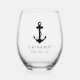 A nautical-themed wine glass for your boat featuring a classic black illustration of an anchor and rope and your boat's name and location in elegant script and typography.