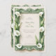 This exquisite wedding invitation exudes classic elegance with its watercolor portrayal of calla lilies set against a backdrop of vintage-inspired, ornate greenery. The timeless appeal of the calla lily, known for its clean lines and graceful curves, is perfectly complemented by the intricate detailing of the baroque-style frame in shades of sage and olive. The front of the invitation offers a stately space for the names of the couple, while the back provides a full invitation to the event, enclosed within the sophisticated border. This design is an homage to the genteel artistry of past eras, ideal for a wedding that aims to blend the traditional with the botanical.