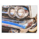Classic american car of 1950th. Partial view of headlights, the front wheel and a bumper