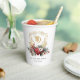 Timeless and elegant yet festive holiday-themed wedding paper cup design featuring classic hand-drawn gold floral crest accented by a colourful spray of red and white Christmas flowers and evergreens. This custom formal template includes editable text fields for you monogram.