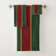 Bath Towel Set Of Three Sizes decorative bathroom amenity and home furnishing decor accessory printed with a Classic Christmas Green And Red With Gold Trim graphic art design illustration by TheFabricSeal print on demand shop at Zazzle.com #ZazzleMade ©️Original. https://www.zazzle.com/store/thefabricseal