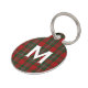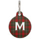 Dog tag done in the red, green, and white Scottish clan MacGregor tartan plaid pattern, on the front, with a large one letter monogram. The back is done in solid red, with white custom text. The custom monogram and text is ready to personalise for your pet.