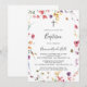 This classic colourful wild floral baptism invitation is perfect for a modern baby baptism or christening. The design features a yellow, purple, white wild flowers with foliage in a rose and green watercolor background.
