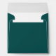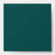 Square envelope in festive dark teal with a printed two-line, white return address on the back flap.