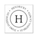 Elegant return address design features your single initial monogram in the centre with a dotted circle border. Your family name and home address are curved around the outside in classic lettering.