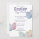 This custom event invitation features a classic Easter Egg Hunt and brunch theme. Decorated Easter eggs in various pastel colours and vintage patterns are placed around the edges. The event information is printed in a whimsical purple font.