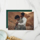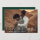 Elegant wedding thank you cards featuring your full-bleed horizontal wedding photo with "Love and Thanks" in white lettering. Personalise the modern photo thank you card with your name. The back of the photo wedding thank you card displays your custom message in white lettering with a solid hunter green background.