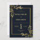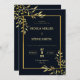 This stunning wedding invitation design features a classic colour combination of navy blue and gold, creating an elegant and sophisticated look. The invitation is set against a deep navy blue background, which adds depth and richness to the design.