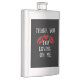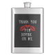 The product is a good size and came exactly as it was pictured. The lid is not attached to the flask, which could be dangerous on drunken nights... The print came out surprisingly well and looks very sharp. Would definitely recommend.