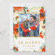 Christmas photo card with red florals and faux gold foil. Watercolor red and cream flowers and green botanicals frame your photo with "Be Merry" below in gold with the name and year.