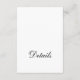 These sophisticated and modern wedding detail cards feature a traditional, elegant layout on a white background with black formal, classic calligraphy and simple text. The back of the desk has the word "details" in script as a decorative element. You can use these black and white cards for driving directions, reception or transportation information, hotel or accommodations information, and any other wedding details you need your guests to know.