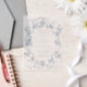 This classic and romantic design is a modern adaptation of an historic French etched frame of dusty blue intertwined roses, flowers, foliage and ribbons ca 1770 by Rococo designer Pierre Ranson. It includes customizable text fields.