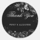 Introducing the timeless allure of our Classic Gothic Black Wedding Thank You Classic Round Sticker design, where elegance meets the ethereal. An enchanting touch of dark romance adorned with intricate botanical motifs, featuring black backgrounds embellished with lush peonies and delicate roses that exude a moody sophistication perfect for your special day. Offering an aesthetic of gothic opulence with the contrast of black and white floral elements against the deep dark, with white formal vintage calligraphy paired with sophisticated serif to create a balanced and versatile style especially perfect for fall and winter weddings, but equally suited for a mysterious, magical spring or summer event. As with all of our designs, if you have any special requests for coordinating products, please do not hesitate to reach out to us. We would love to help you fully capture your perfect romantic gothic love story.