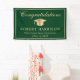 Classic green graduation party welcome banner featuring a gold grad cap, "Congratulations" in an elegant script and the graduate's name, school and class year in modern typography.