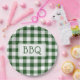 Get ready for your barbecue party with paper plates featuring a classic dark green and white buffalo plaid with the letters BBQ in a white rectangle in the centre.