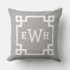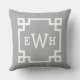 A classic grey throw pillow featuring a customisable three-letter monogram inside a white Greek key geometric border frame. The clean white-on-grey design creates a versatile, refined accent for any room. Personalise with your initials or a couple's monogram for a thoughtful housewarming or wedding gift.