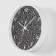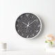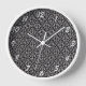 This wood wall clock has white hands and numbers with a classic minimalist damask pattern done in black and white with diamond shaped white scrolls.