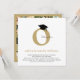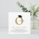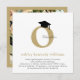 This classic and simple gold and white graduation party invitation card design features a bold monogram letter 'o' of the graduate with a mortar board / graduation cap as an accent.