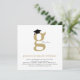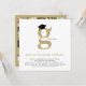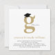 This classic and simple gold and white graduation party invitation card design features a bold monogram letter 'g' of the graduate with a mortar board / graduation cap as an accent.
