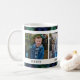 Stylish Christmas coffee or hot cocoa mug features three (3) favourite holiday photos and your choice of custom text. The default design includes pictures of two siblings, their names, and a photo together with the year. Design features a classic navy blue, hunter green, and black watch Scottish tartan plaid border with a crisp white background to highlight your photos. Photo credit: Sunbeam Photography www.facebook.com/SunbeamPhotography
