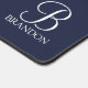 features personalised monogram in white classic script font style and name in white classic serif font style on navy blue background.