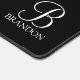 features personalised monogram in white classic script font style and name in white classic serif font style on black background.