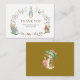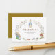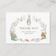 Charming Beatrix Potter-inspired thank you enclosure card for your baby shower! Showcasing Peter Rabbit centered in a whimsical floral wreath with bunnies, a squirrel holding a gift, garden accents, and delicate blooms. Warm gold lettering says "THANK YOU FOR SHOWERING US WITH LOVE!" Ideal for storybook, spring, or bunny-themed events—perfect as a matching set with invites. Fully editable text, elegant design.