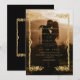 Modern stylish dark wedding invitation black with gold dust on with a gold ink pour effect (the gold is a digital effect, not real foil) and modern calligraphy. Classy and elegant, simple and modern invitation.