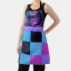 On this two tone stylish apron is pink and purple tropical ferns on a black backdrop then a lavender sash in the middle then a classic retro chequered pattern with black, pink , purple and blue squares which compliments this colourful classic apron.