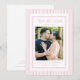 Announce your wedding in a soft, romantic style with this Classic Pink Stripes Photo Wedding Save the Date, featuring “Save the Date” in elegant script and your wedding date displayed just below for a refined, traditional introduction. Your engagement photo is centered within a classic double border, while your names and wedding location are arranged beneath in a tailored layout. A blush pink striped background surrounds the design, adding a light and airy touch while maintaining a polished and timeless feel. The back of the card features a coordinating layout with a QR code and space for your wedding website, allowing guests to easily access additional details, RSVP information, and event updates. Ideal for spring and summer weddings, garden ceremonies, and elegant venues, this pink save the date offers a graceful and classic design that feels both romantic and enduring.
