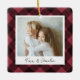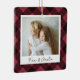 A sweet double sided photo ornament displaying a favourite photo on each side, on a black and red buffalo plaid background. Personalise with a custom caption on the front in handwritten lettering, and add the year to the back.