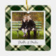 A sweet double sided photo ornament displaying a favourite photo on each side, on a festive green plaid background. Personalise with a custom caption on the front in handwritten lettering, and add the year to the back.
