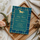 A preppy, classic baby shower invitation with equestrian and plaid elements in navy and hunter green with gold tone accents. A running horse silhouette adorns the top and the tartan pattern adds a timeless touch. Perfect for an Old Money themed baby shower with a classic, vintage and luxurious feel. If you like grandpa core, vintage style this is a great baby shower invite. Available in print and as a digital download. Customise this editable baby shower invitation template with your own event details.