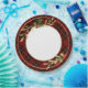 Beautiful and festive holiday design featuring faux gold leaves and holly with centre white circle on rich red, black and gold tartan background.