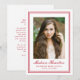 Celebrate your graduate’s achievement with this timeless red photo graduation announcement, designed with a refined double border frame that adds classic structure and elegance. The graduate’s portrait is centered within the clean, balanced layout, with their name displayed below in graceful script, followed by their school and graduation year in traditional serif lettering. The back provides space for a personalized announcement message, allowing you to share their milestone and express your pride with family and friends. Perfect for high school and college graduates, this formal photo graduation announcement offers a polished and meaningful way to commemorate their accomplishment.