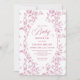 Celebrate your upcoming arrival with this elegant baby shower invitation featuring classic French toile de Jouy roses. Soft dusty pink, blush, and pink and white floral patterns create a timeless, romantic look accented by refined rose gold tones. Professionally printed by Zazzle, this design offers crisp details, beautiful color balance, and a smooth, high-quality finish that highlights the intricate rose pattern. Perfect for a classic, floral, or vintage-inspired baby shower, this invitation is fully customizable and arrives polished and photo-ready. A charming choice for welcoming baby with graceful, traditional floral style.