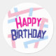 A colourful birthday sticker with the words "Happy Birthday in bold letters.
