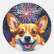 Classic Round Stickers with Rainbow Color Fireworks and Playful Corgi