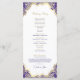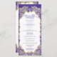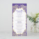 This wedding program showcases a minimalist design in regal purple and elegant gold. The front highlights the couple’s names inside a refined golden frame set against a deep purple background, giving a rich and distinguished look. The back presents the wedding details in a clean, modern format with subtle golden accents. The balance of purple’s royal tone with gold’s timeless luxury creates a sophisticated and charming program, perfect for elegant and formal weddings.