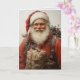 This image portrays a joyful Santa Claus, styled in a classic and realistic manner reminiscent of Norman Rockwell's work. Santa is dressed in a traditional red outfit with a fur-lined hat, his face framed by a thick, snow-dusted white beard. He wears a warm smile that conveys kindness and cheer. A rustic backpack filled with gifts is slung over his shoulder, and the background includes festive greenery and holly, adding to the Christmas spirit. The image captures the warmth and magic of the holiday season.