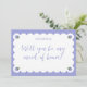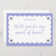 Ask your maid of honour in style with this romantic proposal card, featuring soft periwinkle tones, elegant scalloped edges, and delicate hydrangea illustrations in each corner. The handwritten script question paired with a customisable name creates a refined yet personal look—perfect for spring and summer weddings with a garden, floral, coastal, or vintage theme. Thoughtful and on-trend, this card adds a sweet touch to your bridal party proposal.