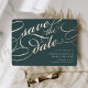 Elegant wedding save the date cards in rich forest green feature "save the date" in luxe rose gold foil script lettering for a bold and unforgettable look. Personalise with your wedding details in classic white lettering, and add additional information to the back.