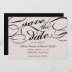 Elegant save the date cards in timeless black and soft, muted cameo blush pink feature embellished script lettering for a classic, formal look.