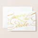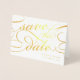 Chic gold foil folded cards display your save the date details in unique and elegant style. Front reads "save the date" in embellished calligraphy script lettering, with your names and wedding date at the corner. Open the card to reveal a favourite photo with "save the date" overlaid in white, and your wedding details beneath in classic black lettering.