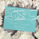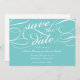 Elegant save the date cards in classic robin's egg blue and white feature embellished script lettering for a classic, formal look.